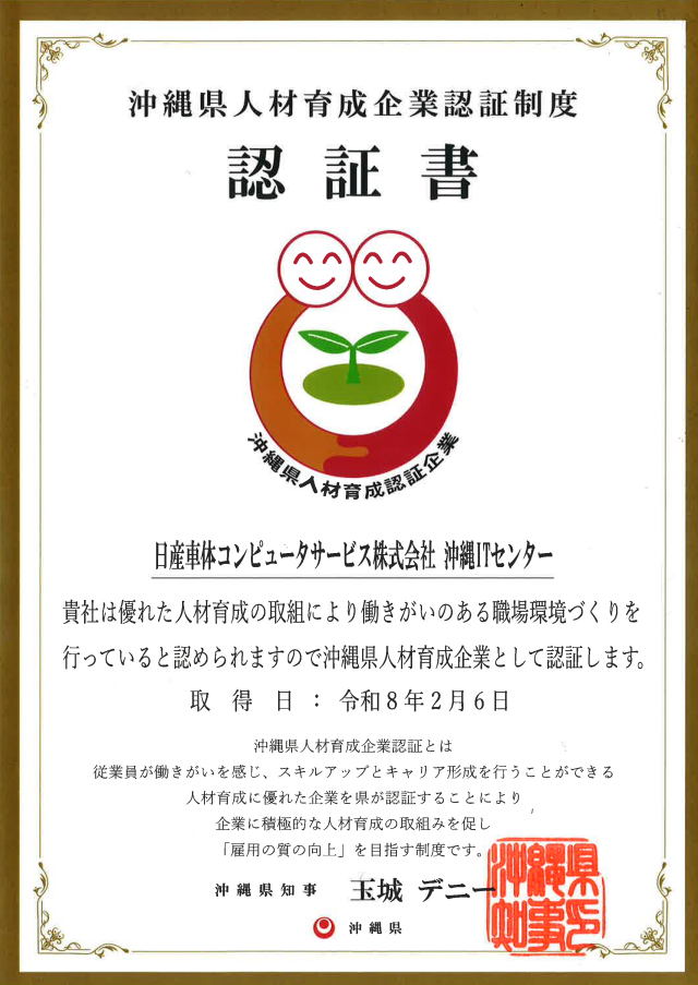 当社の沖縄ITセンターは2026年2月6日付で 「沖縄県人材育成認証制度」 を取得いたしました。